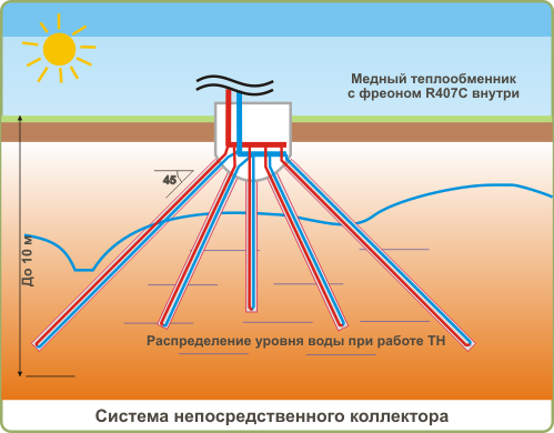 Система с непосредственным коллекторомВ приямке глубиной 1м вымываются скважины под углом 45 градусов, длинна каждой скважины как правило до 15 метров. Количество скважин зависит от мощности ТН DariaWP.В скважины опускаются медные коллектора с фреоном R407. При включении ТН DariaWP, компрессор теплового насоса самостоятельно начинает прокачивать фреон R407C по таким коллекторам, используя при этом максимально эфективно теплообмен с землей. Процесс испарения происходит в данном случае непосредственно в коллекторе (теплообменнике) находящемся под землей. Преимущества данного метода: