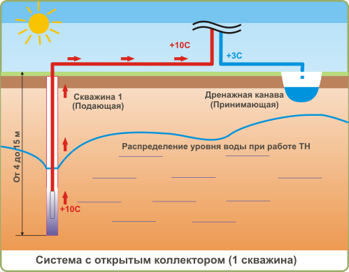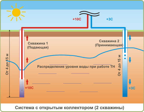 Система с открытым коллектором на 2 скважиныВымывается две скважины, на растоянии не менее 10 метров, до первого водоносного слоя достаточного обеспечить необходимый объем воды. Подбирается нужный водяной насос с характеристиками указанными в таблице ниже (м3\ч).